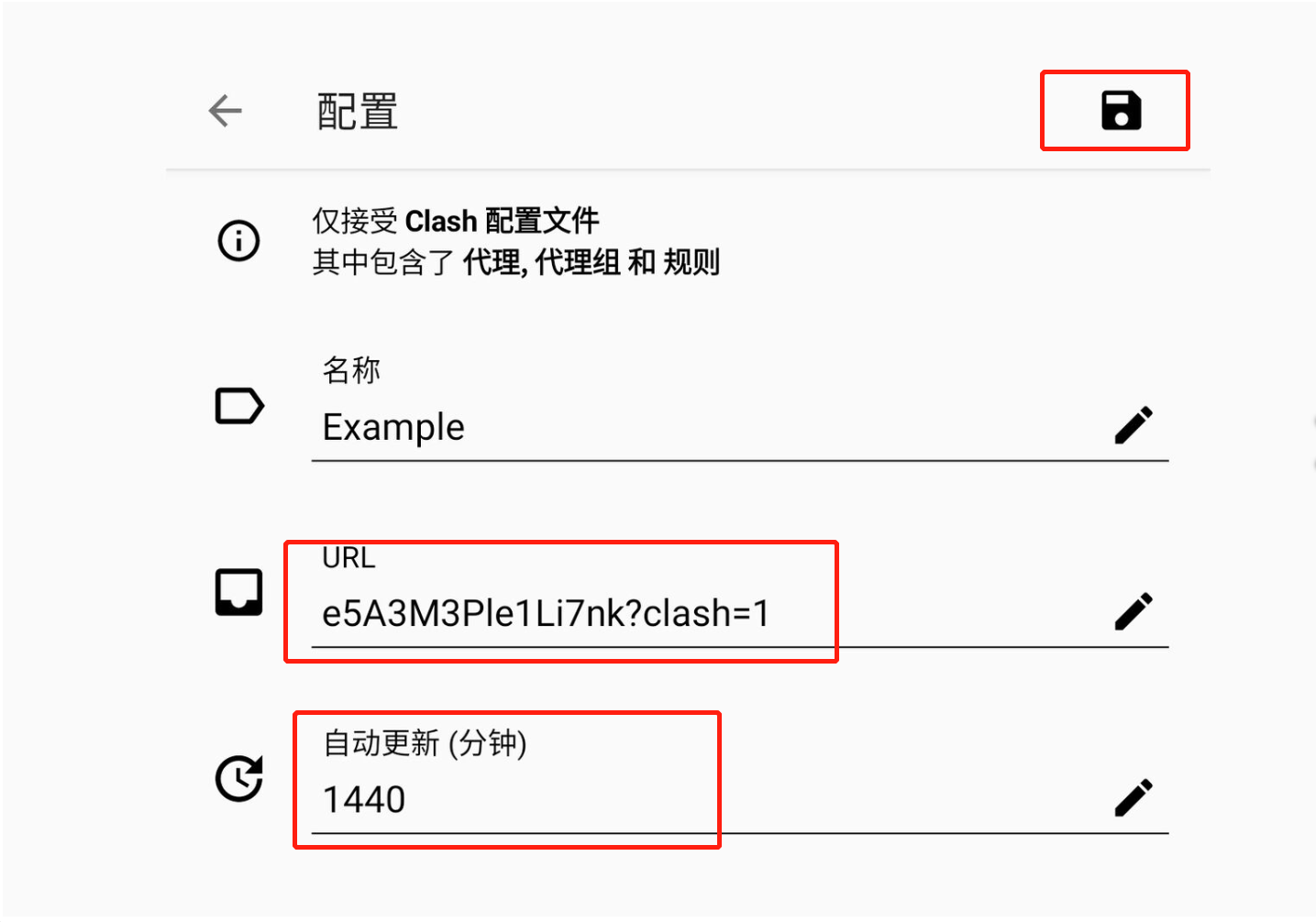 3、在 URL 一栏中粘贴 Clash 订阅链接;自动更新 (分钟) 推荐填写 1440 ,即每 24 小时自动从链接更新配置文件。