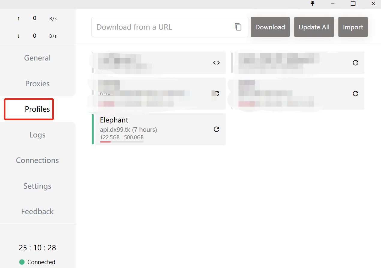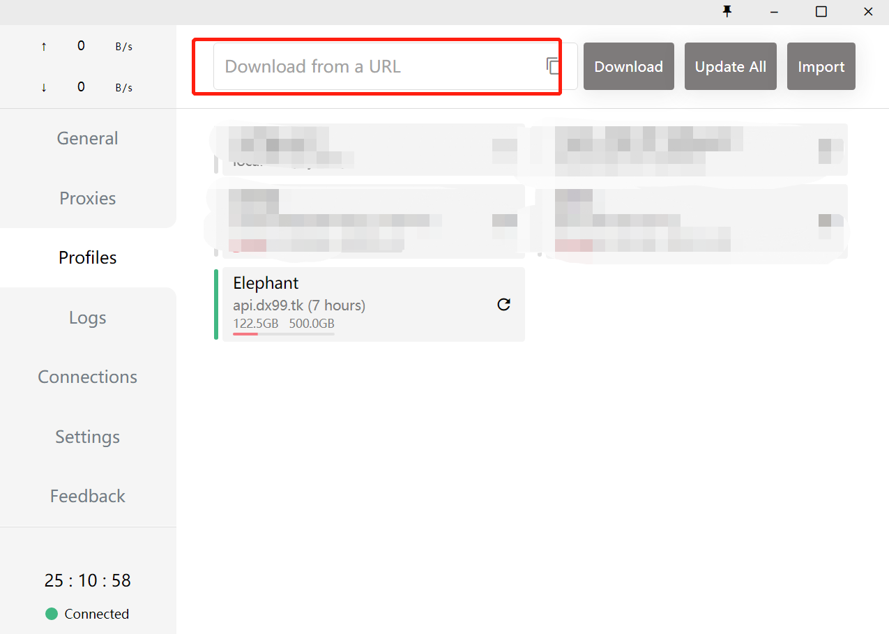 2、在 Profiles 页面顶部,粘贴 Clash 配置订阅链接,随后点击 Download 下载配置文件