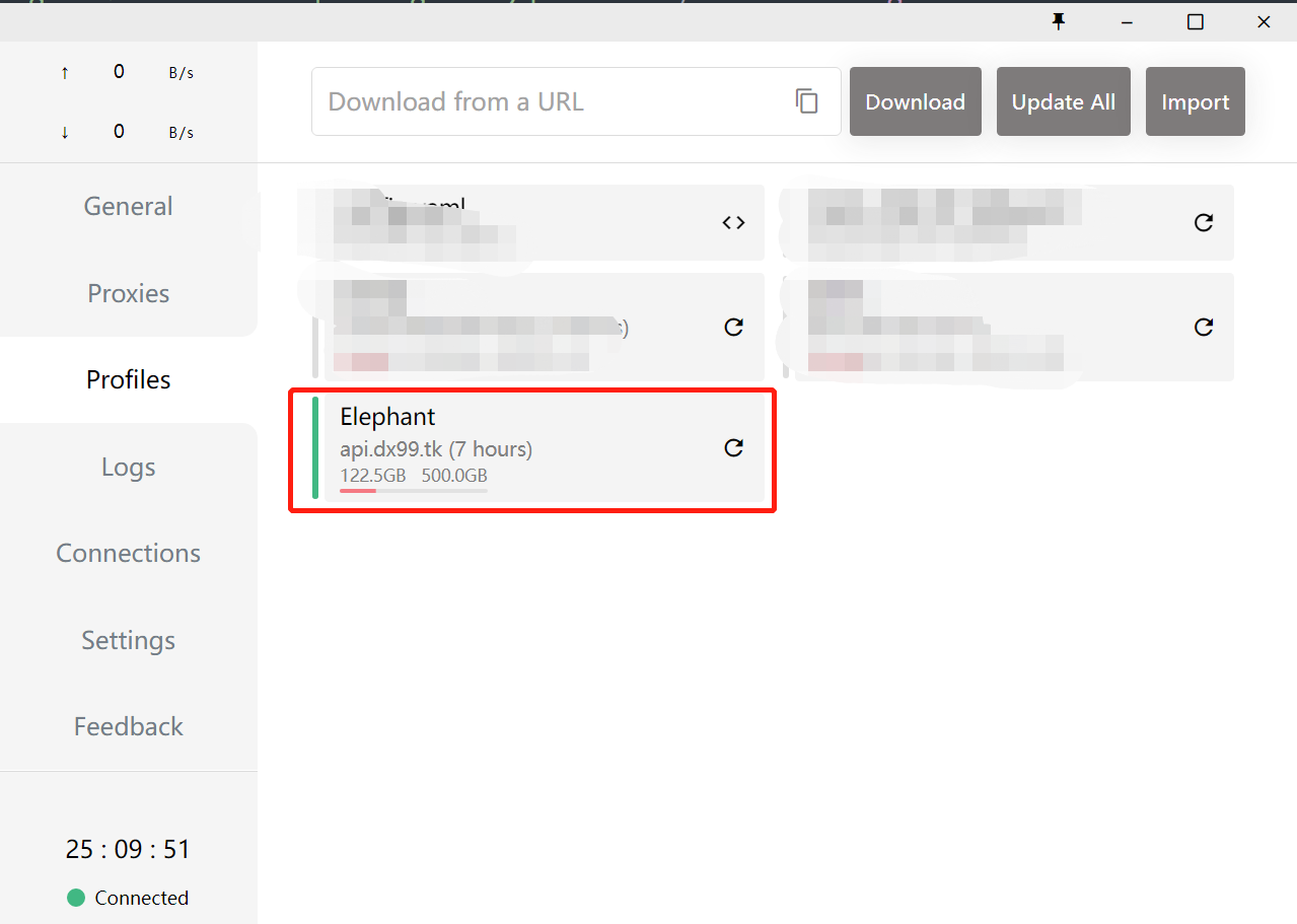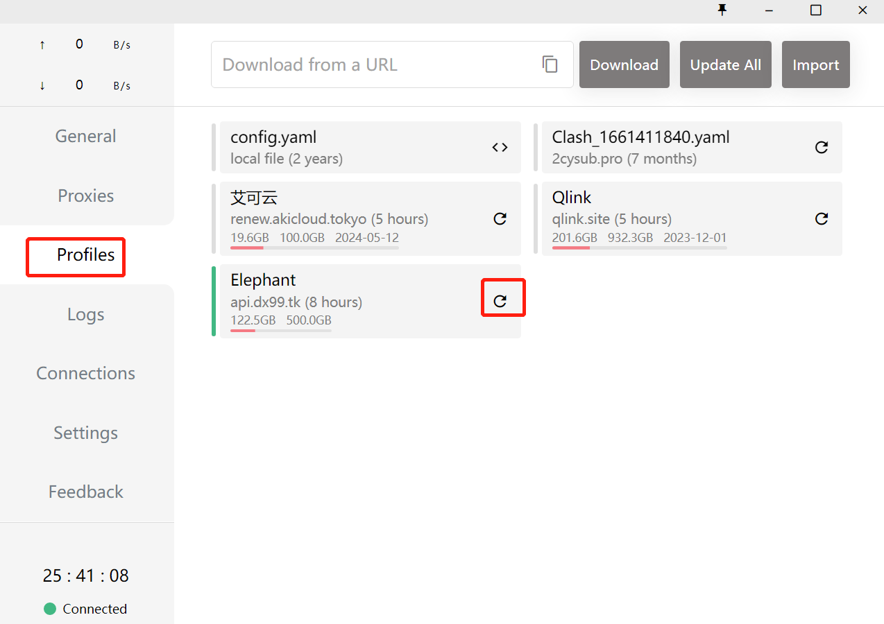 3、如果发现某些线路无法使用,点击profiles里的elephant配置文件中刷新按钮进行刷新线路