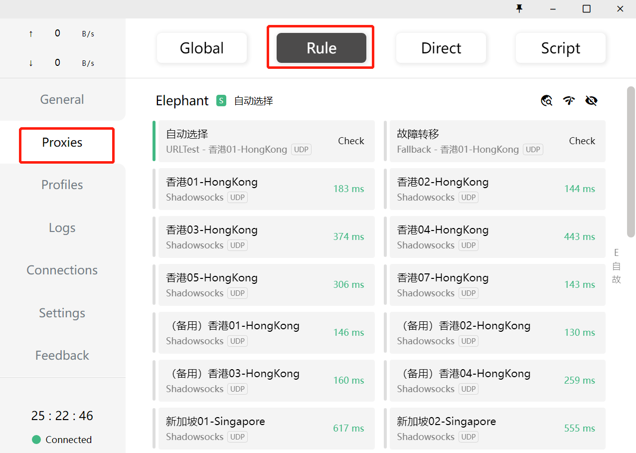 1、点击Clash for Windows 窗口左侧的proxies,选择"rule"