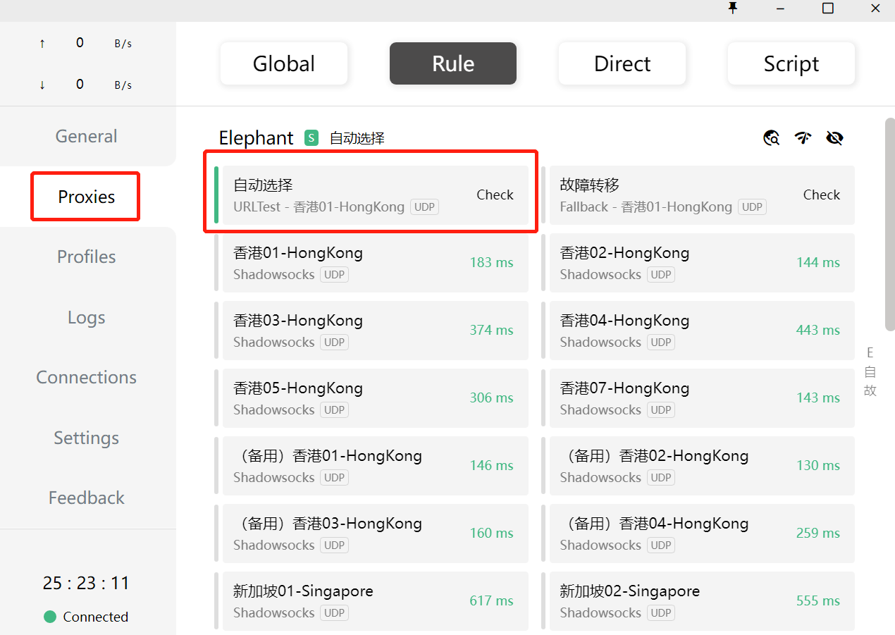 2、在proxies中,选择相应的线路,建议选择"自动选择"