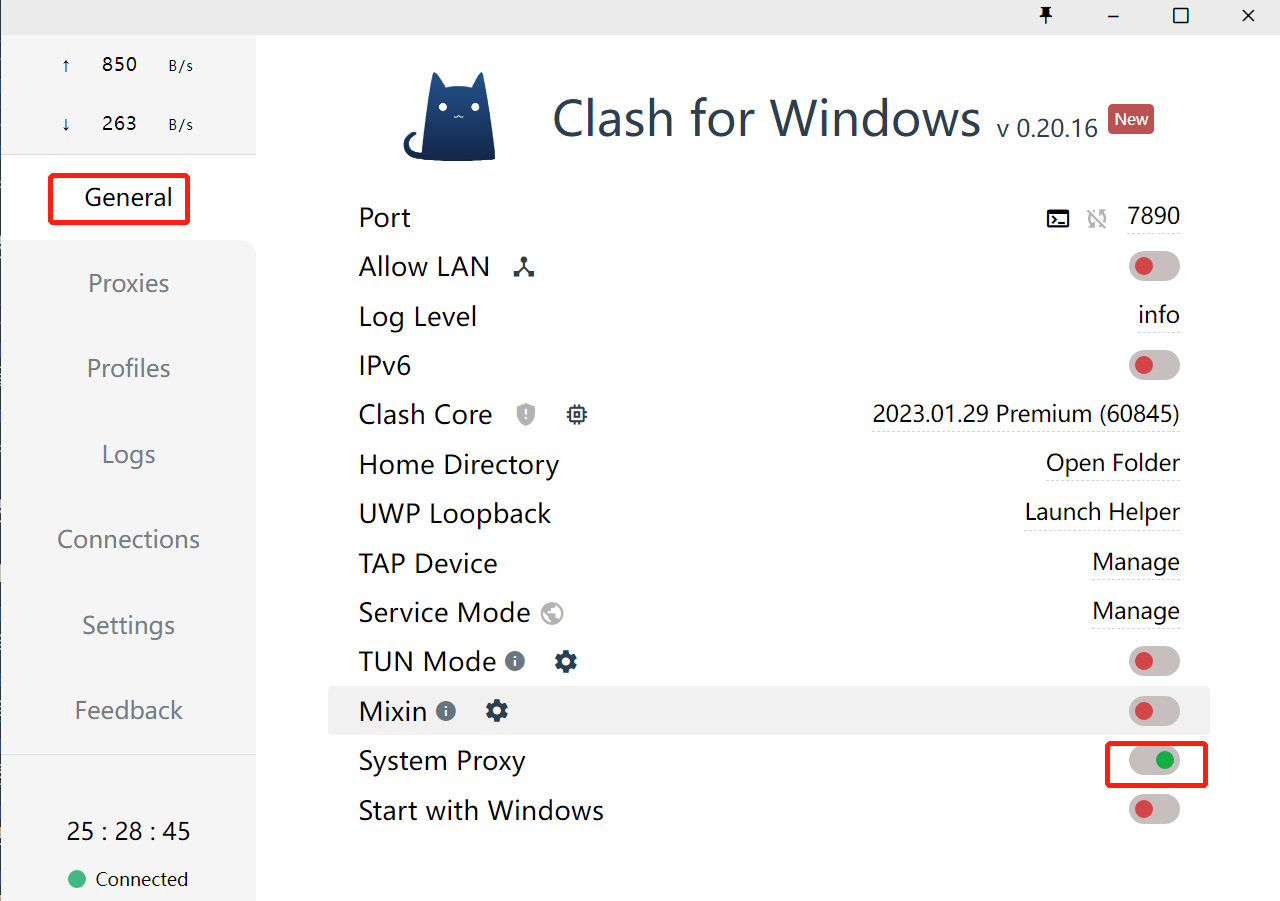 1、点击Clash for Windows 窗口左侧的General,重新勾选"system proxy"选项