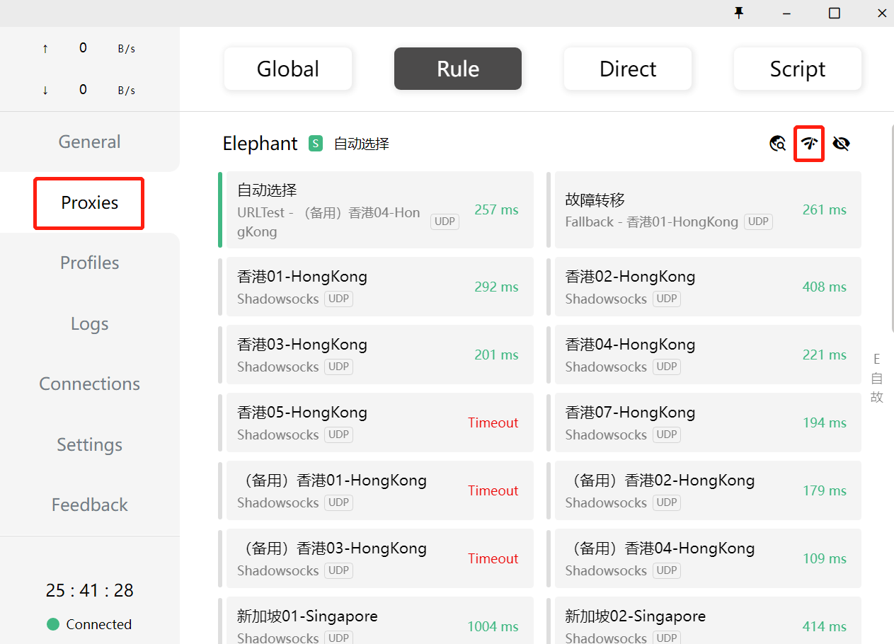 4、如果需要对某些线路进行测速,请点击proxies里的WiFi按钮进行测速